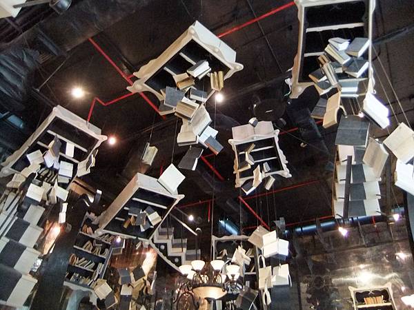 也有許多單本的書籍倒掛在上方 而且會隨著店內所播放的音樂上下地擺動著