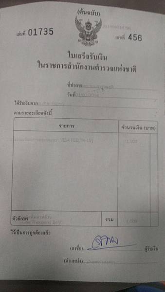移民關人員檢查OK後 除了會在護照上蓋章並交還之外 還會另給一張辦理落地簽證費用的收據