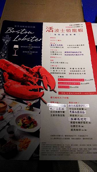 VIP首次造訪當天 餐廳有推出包含波士頓龍蝦的海陸超值套餐 原價$1980給予折扣後的優惠價是$1580