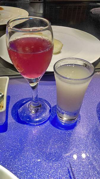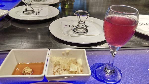開胃飲品玫瑰蘋果醋 只要喝得下都任你喝 可請服務人員無限添加 一旁是可搭配主菜的芥末醬油 & 洋蔥丁