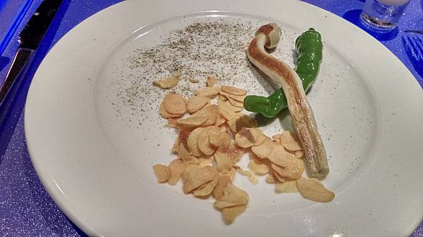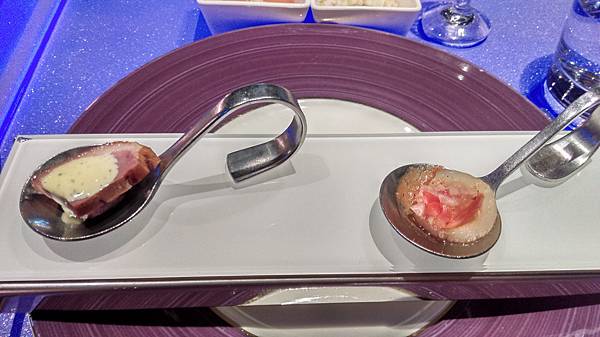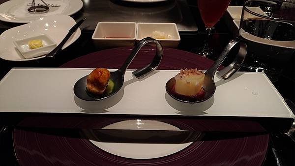 首先送上精緻開胃菜 做成放在湯匙上的一口料理 服務人員建議先吃右邊 再吃左邊 口味由淡轉濃