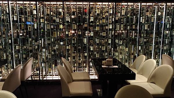 以酒瓶裝飾而成的紅酒牆十分地醒目亮眼
