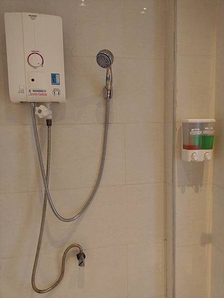 提供的是電熱水器 牆上並有按壓式的洗髮精 & 沐浴乳