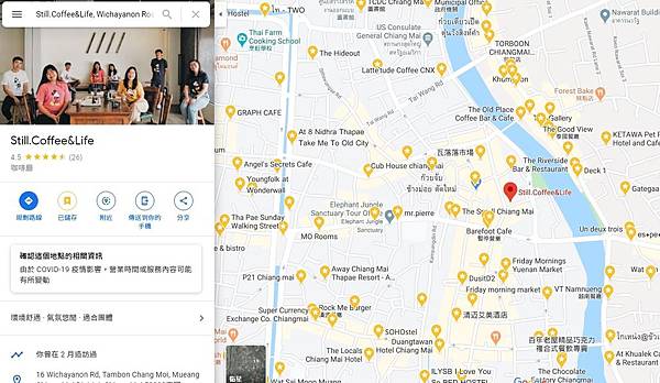 如地圖所示 Still.Coffee & Life 位於古城外東邊靠近Ping River 畔的Warorot 老城區內(紅色游標處)