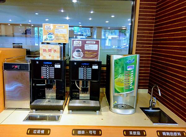 另外除了有可自行用熱開水沖泡的各式茶包之外 還有熱咖啡 可可 & 茶類飲品