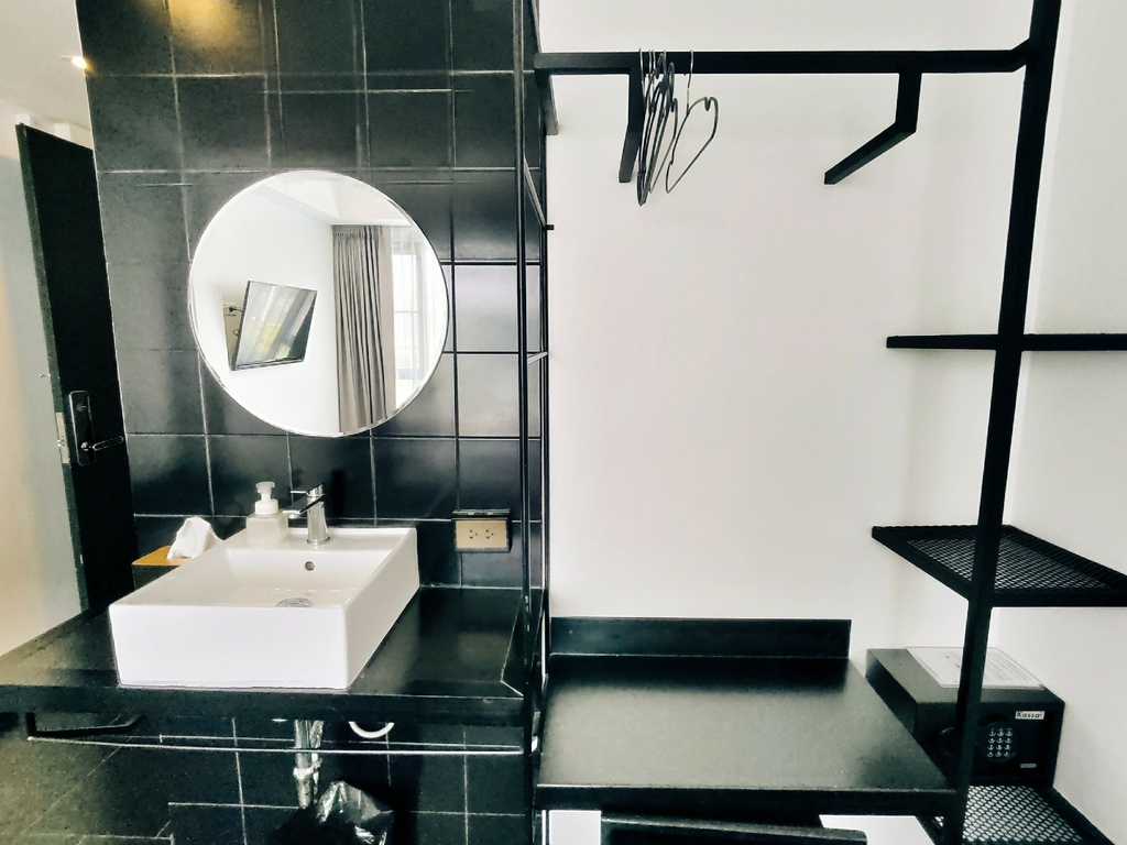 保險箱設置在開放式衣櫥旁邊 另一邊是盥洗台 而不是規劃在浴室內 若是二人入住就不會影響到彼此使用