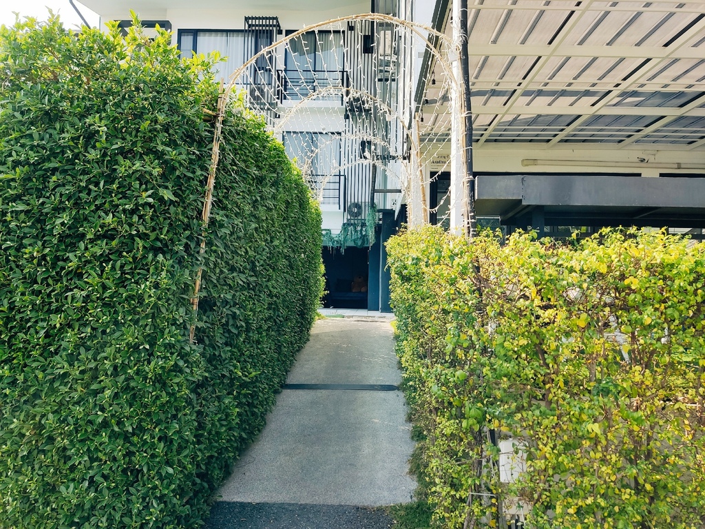 兩旁被綠色植栽所包圍的旅店入口處