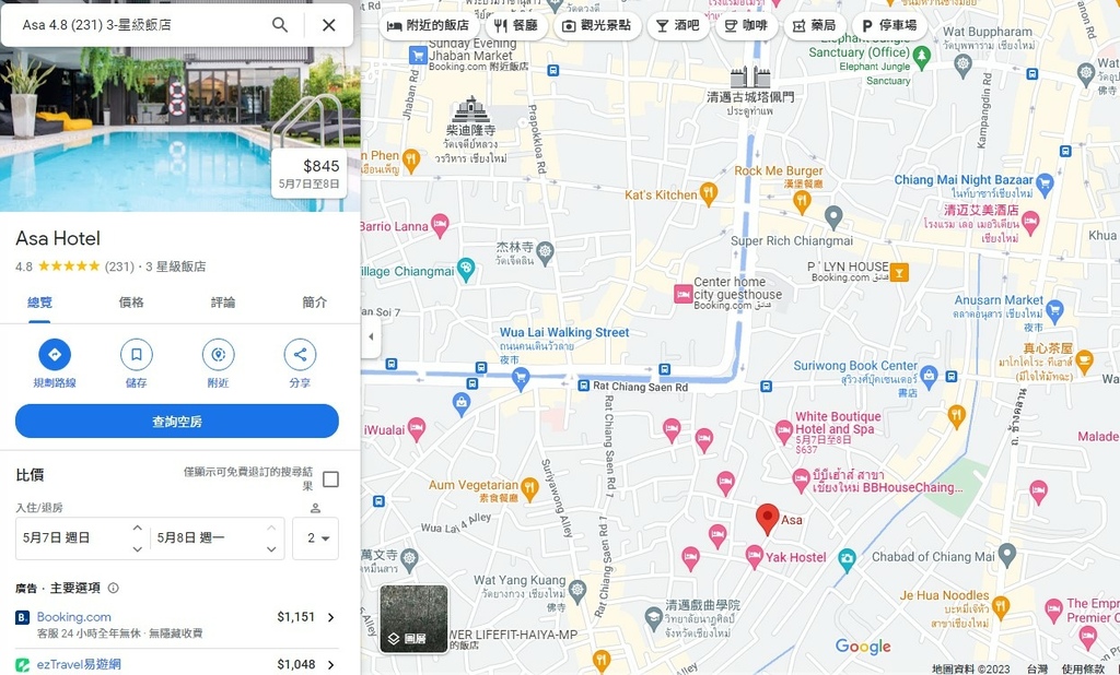 Asa Hotel位於清邁古城區東南角外不遠處的巷弄內位置 GPS座標為"18.777670, 98.993670"