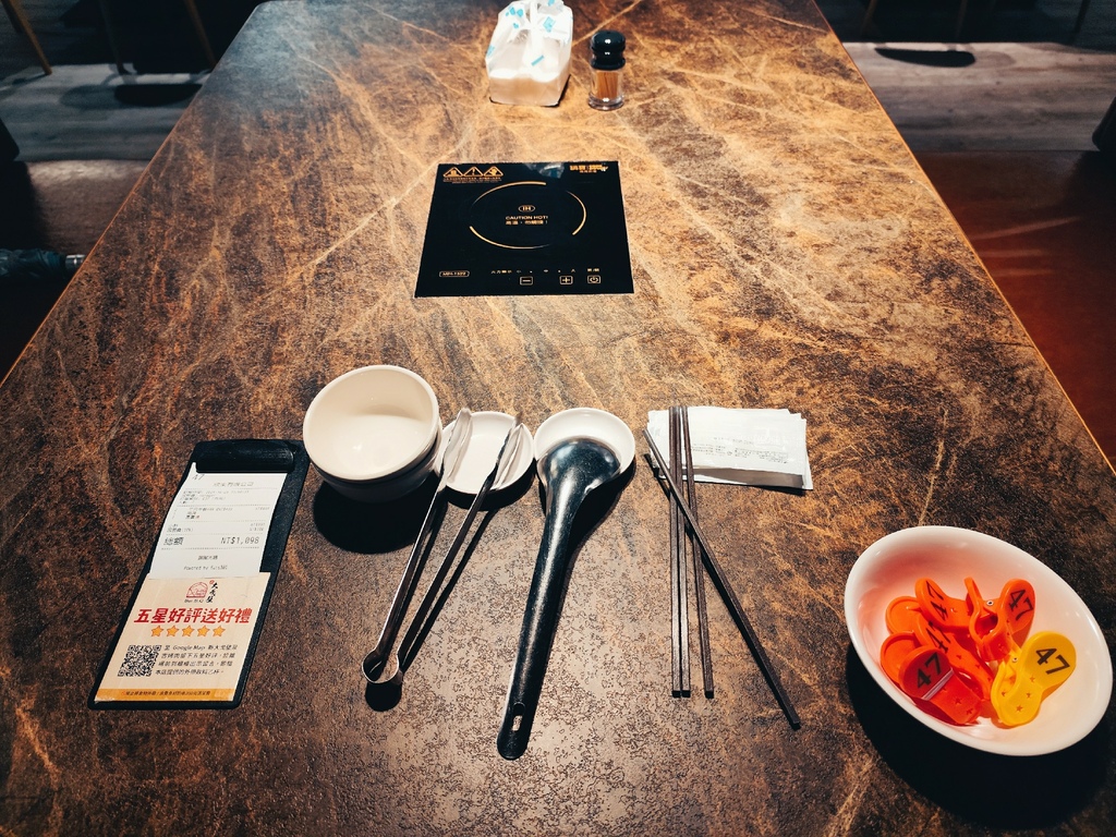 桌上擺設 寫上桌號的號碼夾是去夾取蒙古烤肉時要使用的 記得隨身攜帶