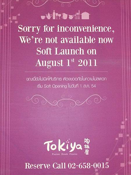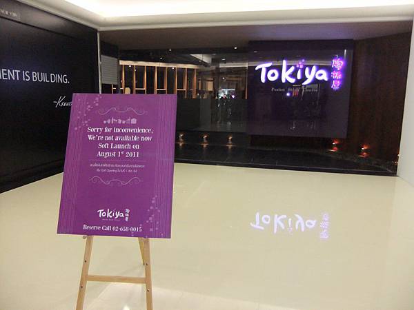 現場的看板告示上是寫Tokiya 陶板屋預計於8/1開幕 目前可先以電話方式預訂座位