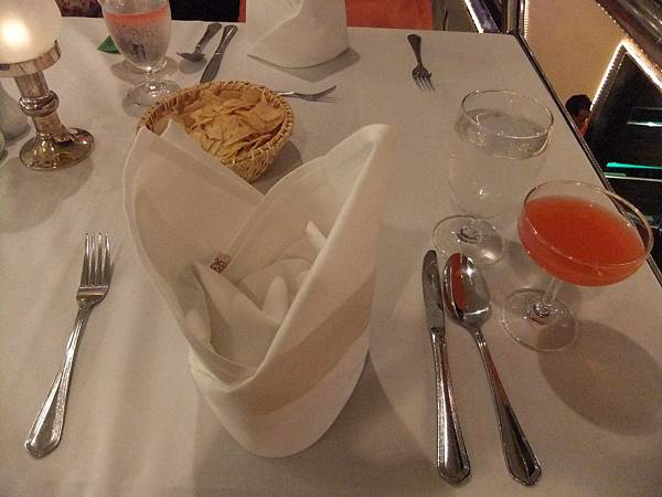 免費招待的餐前蝦餅 一人還有一杯雞尾調酒 白開水是免費的 若要加點其他飲料 & 酒類則要額外自費
