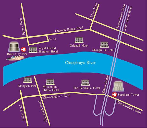 若是搭乘計程車前往的話 就跟司機說要到Sipraya Rd.底 靠近昭披耶河的River City 即可